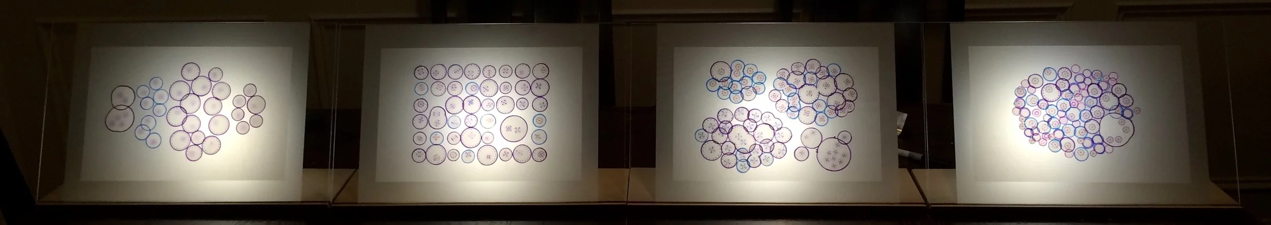The gallery exhibit is set of 4 slides, each slide is a paper collage mounted between 2 sheets of acrylic plates. The slides sit on wooden planks and is back lit by custom made light boxes. Accompanying the images are description cards that take the reader through the steps of the discovery.